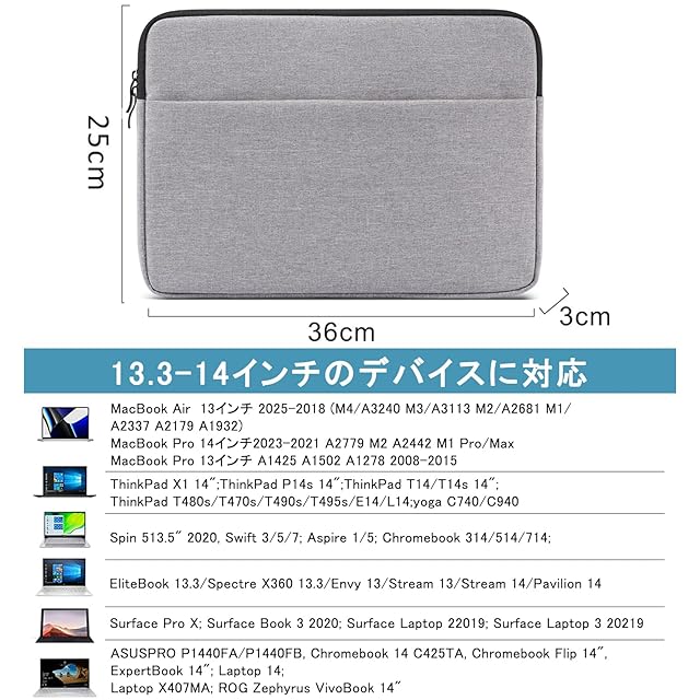 ノートPCバッグのサイズ:ケースの寸法:365 x 258 x 20mm(外寸)346*240*18mm(内寸)。13 - 14インチノートパソコンケース対応MacBook Pro 14(2024-2021:M1/M2/M3/A2442 A2779 A2918 A2992 、MacBook Air 13(M4 M3 M2/A3240 A3113 A2681 M1/A2337 A2179 A1932)、MacBook Pro 13(M2/A2338 M1/A2289/A2251/A2159/A1989/A1706/A1708 )、iPad Pro 12.9(3rd/4th/5th Gen)、Surface Pro 2017/Surface Laptop Studio2021。人工計測となります為、 誤差が生じる場合がございます。また、同じ画面サイズのノートパソコンであっても、本体の長さ、幅、高さに違いがある場合がございます。ご購入の際は必ず型番だけではなく本体のサイズをお調べの上お買い求めください。