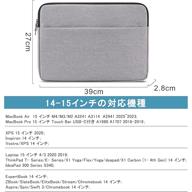 ノートPCバッグのサイズ:ケースの寸法:390 x 270 x 28mm。内寸:370x250x25mm。大部分の15型ノートPCに対応。例えば: 15インチ MacBook Air M4/M3/M2 A3241 A3114 A2941 2025~2023 | Touch Bar USB-C付き A1990 A1707 2016-2019 | Laptop 4/3 | XPS 15 & Vostro/XPS/Chromebook 14 | Spin 3 | Aspire 1 Cloudbook/ Swift 3 14 | ThinkPad X1 Yoga / X1 Carbon (1-4th Gen)/ ThinkPad T-Series/E-Series/Ideapad/Flex/Yoga 14 | Probook/Pavilion/ZBook/SlateBook/EliteBook/Stream/Chromebook 14。