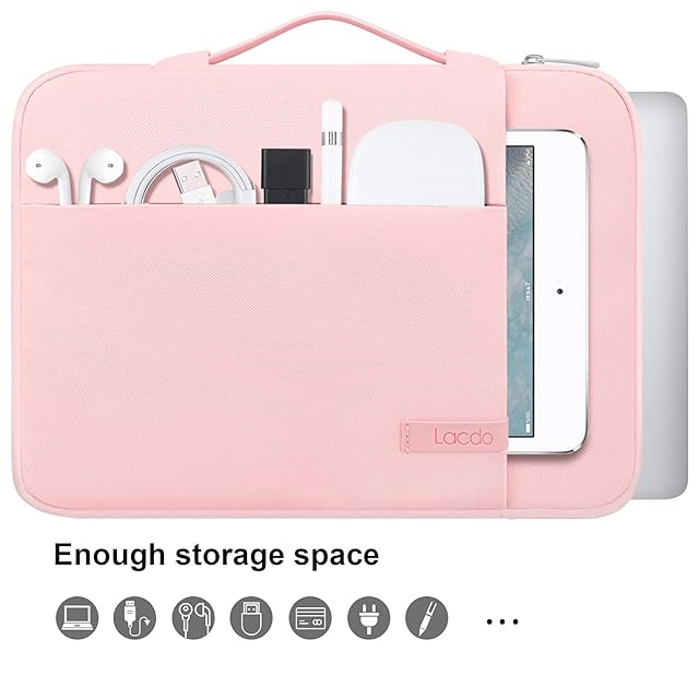 十分な収納スペース: ラップトップ用のメインコンパートメントを除けば、このキャリングスリーブケースバッグはさらに2つのフロントアクセサリーポケットと背面に1つの大きなコンパートメントがあり、小さなiPad、マウス、充電器、電源コード、ケーブル、イヤホン、ペン、ハードドライブ、パワーバンクなどを収納できます: ノートパソコンや電子アクセサリーを素早く取り出せます。Lacdoのプロフェッショナルなラップトップバッグは、あなたのアイテムを安全かつ整然と保ちます、