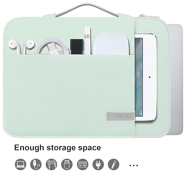 十分な収納スペース: ラップトップ用のメインコンパートメントを除けば、このキャリングスリーブケースバッグはさらに2つのフロントアクセサリーポケットと背面に1つの大きなコンパートメントがあり、小さなiPad、マウス、充電器、電源コード、ケーブル、イヤホン、ペン、ハードドライブ、パワーバンクなどを収納できます: ノートパソコンや電子アクセサリーを素早く取り出せます。Lacdoのプロフェッショナルなラップトップバッグは、あなたのアイテムを安全かつ整然と保ちます、