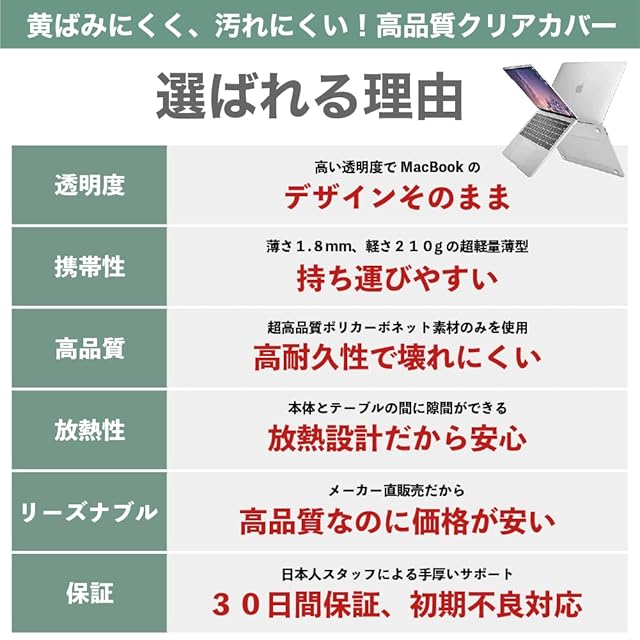 ◆放熱設計底部のカバーには排気口がついているため、通気性がよく、熱を放散してくれます。更に、底部の四隅のゴム足設計により、テーブルとの間に隙間ができ、熱を流しやすくなります。また、ゴム足はテーブルとの摩擦が生じるため、本体が滑るのを防止できます。 超薄軽量、装着簡単上下カバー分離しており、単体使用が可能。機体にぴったり合わせて、取り付けや取り外しも簡単に操作できます。何度開閉してもMacBook本体の邪魔にならず、まるで何もつけてないかのように、薄くて軽く、持ち運びしやすいので、負担になりません。