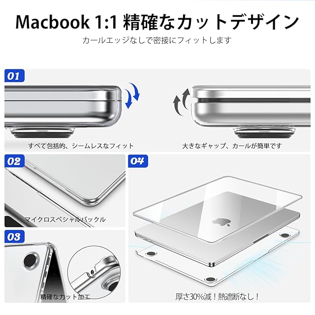 [高品質素材、耐久性があり割れない] - Macbook air ケース 高強度のポリカーボネート(PC)素材を使用し、優れた衝撃吸収性と耐摩耗性を備えています。日常的な引っ掻き、指紋、衝撃、ほこりからしっかり守ります。特別な黄変防止コーティングにより、長期間透明さを保ち、耐久性も抜群。MacBookの外観を新しいまま維持し、転売価値を守ります