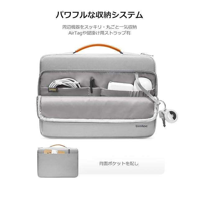【必需品を丸ごと収納】コンパクトでながら3室。大きなフロントポケットに幾つのポケットとAirTag・鍵掛用ストラップを備え、充電器・ケーブル・ハブ・10.9 インチ iPad Air/ 11インチ iPad Proなどのアクセサリーを丸ごとに収納や簡単に整理整頓できます。背面にもポケットがあり、書類やICカードなどよく出し入れのモノを収納できます。このバッグだけで楽々にお出掛け可能!