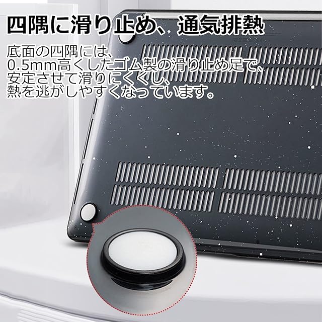 【四隅に滑り止め、通気排熱】底面には空洞デザインを採用し、Macbook Airの放熱を促進します。底面の四隅には、0.5mm高くしたゴム製の滑り止め足で、安定させて滑りにくくし、熱を逃がしやすくなっています。