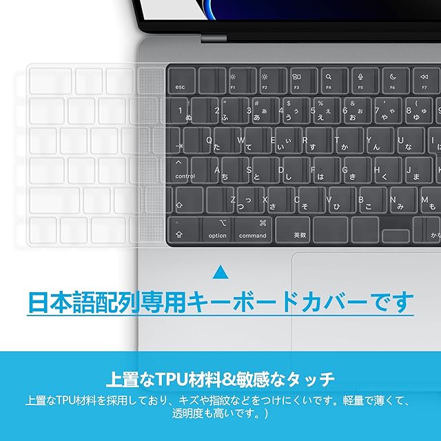 はTPU製で、厚さはわずか0.1mmです。市販のシリコンよりも透明で薄いだけでなく、鍵盤へのフィット感やフィードバックが良く、黄変しにくいのが特徴です。なお、このキーボードカバーは新型MacBook air 13.6インチ 2025 2024 2022 M4 M3 M2 A3240 A3113 A2681 JISにのみ適合し、指紋センサー(Touch ID)部分はカバーされていませんのでご注意ください。