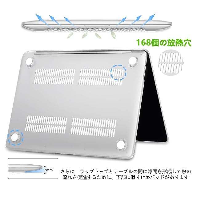【優れた構造設計】: ?精密なカット技術と分割設計により、MacBookの通常の開閉や外部ポートへのアクセスを全く妨げないケースです。 ?ケースの角は全方向から落下しないように設計されています。 ?ボトムカバーには滑り止めパッド(滑り止め性能と通気性を両立)と最大168個の冷却孔を備えています。