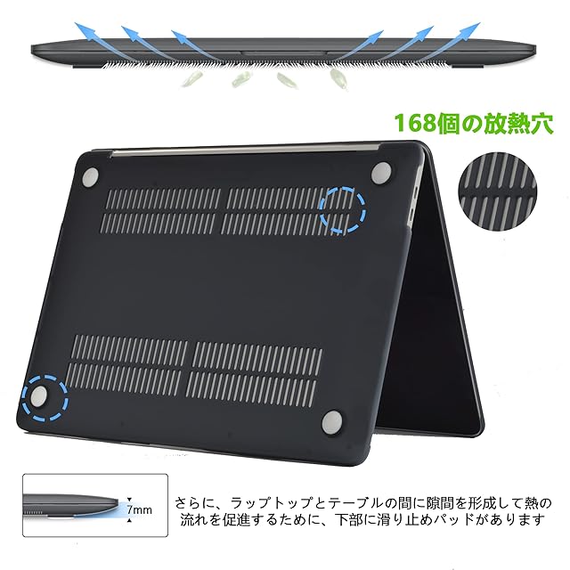 精密なカット技術と分割設計により、MacBookの通常の開閉や外部ポートへのアクセスを全く妨げないケースです。 ケースの角は全方向から落下しないように設計されています。ボトムカバーには滑り止めパッド(滑り止め性能と通気性を両立)と<b>最大168個の冷却孔</b>を備えています。