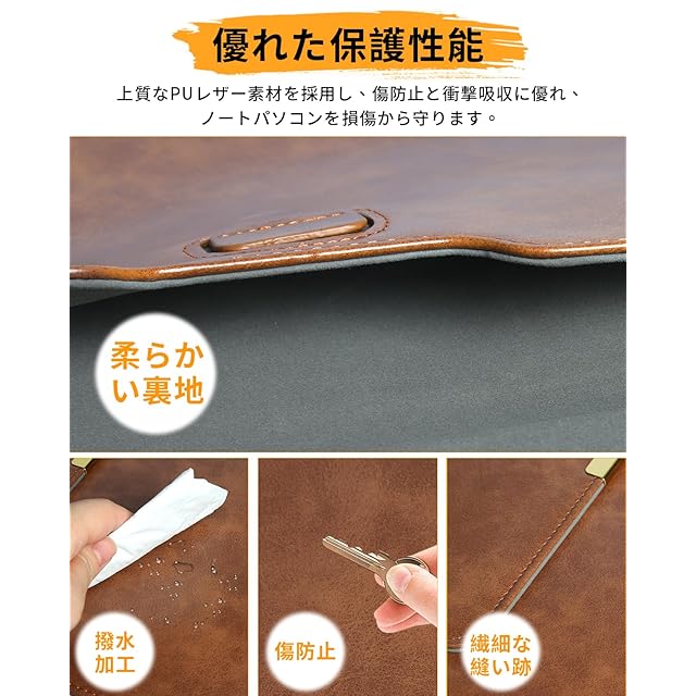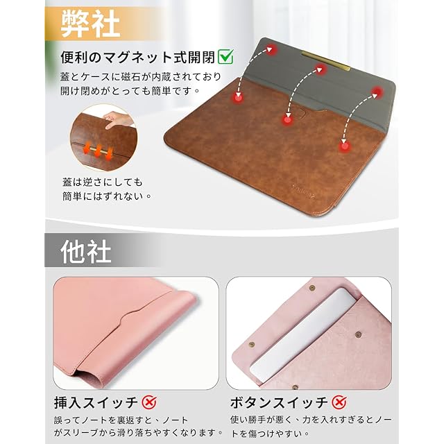 【磁石固定】保護ケースの蓋とケースにマグネットを各2枚内蔵され折り、ファスナーやボタンと違い、使用に便利です、簡単に開きたり、閉じたりできます。PCの出し入れはとても便利です。洗練されたシンプルなデザインで使用するシーンを選びません。しっかりとした厚みのあるPUレザーで使用時の手触りや見た目にも高級感があります。