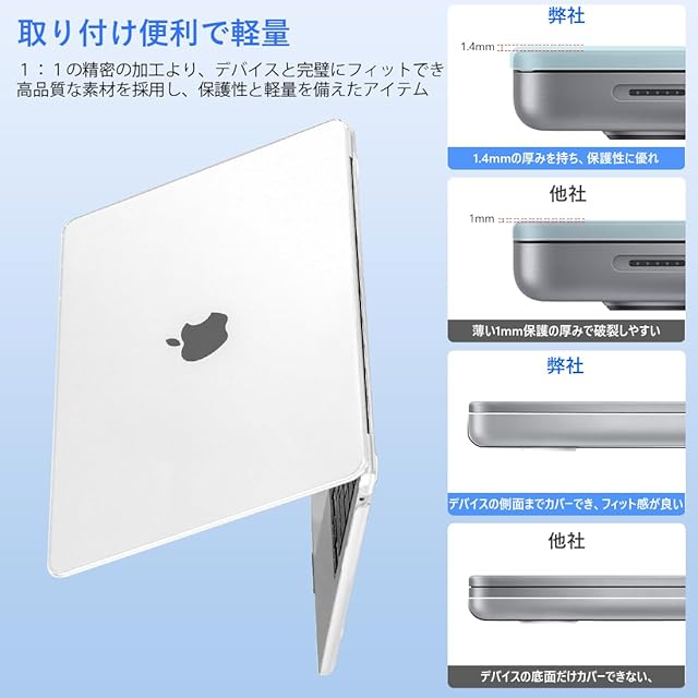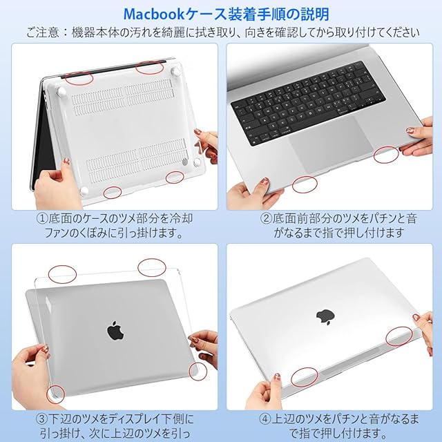 【取り付け簡単】トップカバーとボトムカバーは分離型な設計より、取り付け方が簡単です。機器と向きを合わせて、パチンと音がなるまで押し付けば、取り付けは完了です。何度開閉してもMacBook本体の邪魔になりません。