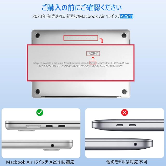 【対応モデル】2023年06月発売されたM2 チップ搭載モデルMacbook Air 15インチ A2941、2024年発売されたM3 チップ搭載モデルMacbook Air 15インチ A3114 と 2025年発売されたM4 チップ搭載モデルMacbook Air 15インチ A3241対応のハードケースです。ご購入前に、必ずお持っているMacBookの底面にある「A」から始まる4桁のモデルナンバー(A1XXX)をご確認ください。