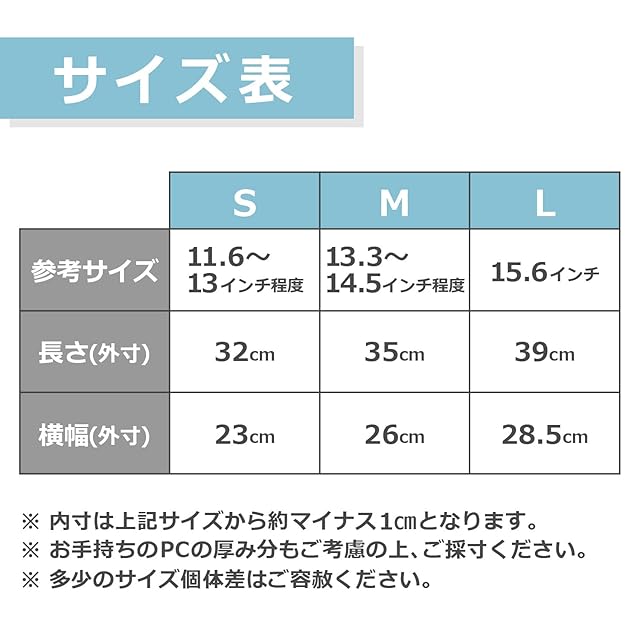 【豊富なサイズ展開】 〇〇専用ではないケースの為、機種を問わずマルチユーズできます。 2台持ちの方も、機種変更した場合も、長くお使い頂けます。 Sサイズ:11,6インチ〜13インチ程度: 32cm x 23cm, 180g : 大きめのタブレットや、Surface Goなどにピッタリです。小さめ、薄型の13インチも入ります。(サイズはよくご確認ください。) Mサイズ:13.3インチ〜14.5インチ程度: 35.5cm x 26cm, 238g : 通常の持ち歩きサイズのノートPCに適しています。(大体13インチ〜14インチ台) Lサイズ:15インチ〜16インチ程度: 39.7cm x 28.5cm, 320g : クリエイター仕事などで大き目サイズを使われる方にピッタリ。15インチ台〜サイズの方は迷わずこのサイズを。 ※上記は外寸サイズです。 ※内寸サイズは約マイナス1cmです。 ※お手持ちのPCの厚み分もご考慮の上、採寸、サイズ選択ください。 ※多少のサイズ個体差はご容赦ください。