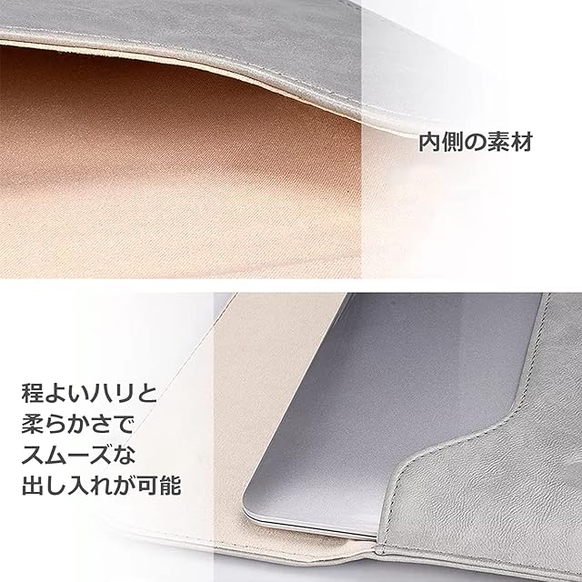 【スタイリッシュなノートPCケース】 シンプル好き、ミニマリストさんに最適の、ノートPCスリーブケースです。どうせノートPC本体以外にも持ち歩くものが沢山あるから、PC専用バッグではなく、自分のバッグに入れて持ち歩きたい方にも嬉しい薄型スリム設計。 通勤、半休の日、OFFの日、など、シーンや気分によってバッグを変えたい方にとっても使いやすい保護ケースです。 シンプルデザインなので、仕事モード、オフモード、シーンを選びません。 また、ケースはPCマット、マウスパッド代わりにもなるので、外で作業する際にも役立ちます。 【撥水加工素材】 表面素材は上質なPUレザー(フェイクレザー)。撥水加工が施されているので、カフェでお仕事する際にコーヒーが付いてもサッと拭くだけでOK。かばんの隙間から入った雨や、ペットボトルの水滴も心配ありません。雨の日でも安心して持ち歩けます。(完全防水ではありません。) 【隠しマグネットボタン開閉】 万が一、中のノートPC、タブレットが滑り落ちてしまわないよう、マグネットボタンでの開閉式です。また、マグネットボタンは隠しボタンになっているので、デザインの邪魔をせず、スタイリッシュな外観で、PC出し入れの際も当たって傷が付かないようになっています。 【豊富なサイズ展開】 〇〇専用ではないケースの為、機種を問わずマルチユーズできます。 2台持ちの方も、機種変更した場合も、長くお使い頂けます。 Sサイズ:11,6インチ〜13インチ程度: 32cm x 23cm, 180g : 大きめのタブレットや、Surface Goなどにピッタリです。小さめ、薄型の13インチも入ります。(サイズはよくご確認ください。) Mサイズ:13.3インチ〜14.5インチ程度: 35.5cm x 26cm, 238g : 通常の持ち歩きサイズのノートPCに適しています。(大体13インチ〜14インチ台) Lサイズ:15インチ〜16インチ程度: 39.7cm x 28.5cm, 320g : クリエイター仕事などで大き目サイズを使われる方にピッタリ。15インチ台〜サイズの方は迷わずこのサイズを。 ※上記は外寸サイズです。 ※内寸サイズは約マイナス1cmです。 ※お手持ちのPCの厚み分もご考慮の上、採寸、サイズ選択ください。 ※多少のサイズ個体差はご容赦ください。 【豊富なカラー展開】 全6色:ブラック、ブラウン、グレー、ブルー、グリーン、ピンク 飽きの来ないシンプルデザインながらも、普通のありふれたケースはつまらない! そんな方の為に豊富なカラー展開。 人と被らないグリーンや、 女性でも持ちやすい優しいカラーなど、 あなたにピッタリなカラーをお選びください。