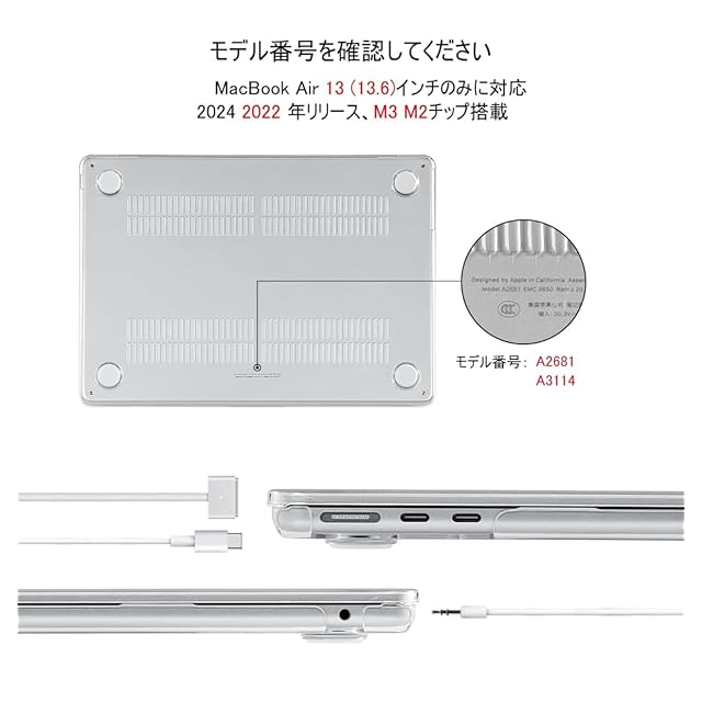 【対応機種】 Macbook 13.6 Air/ M4(A3240 2025年3月発売モデル)/M3( A3113 2024年3月発売モデル)/M2 ( A2681 ) 対応 ※モデル番号はマックブック底面のAから始まるモデル番号をご確認下さい。 MacBook Air 13inchM2/M3/M4用ケース MacBook Air 13.6インチ用のM2/M3/M4用カバーは、兼用です。そのため、どちらのプロセッサーにも対応しています。このカバーは、MacBook Airのサイズに完璧にフィットし、しっかりと保護しながら、優れたデザインと使いやすさを提供します。
