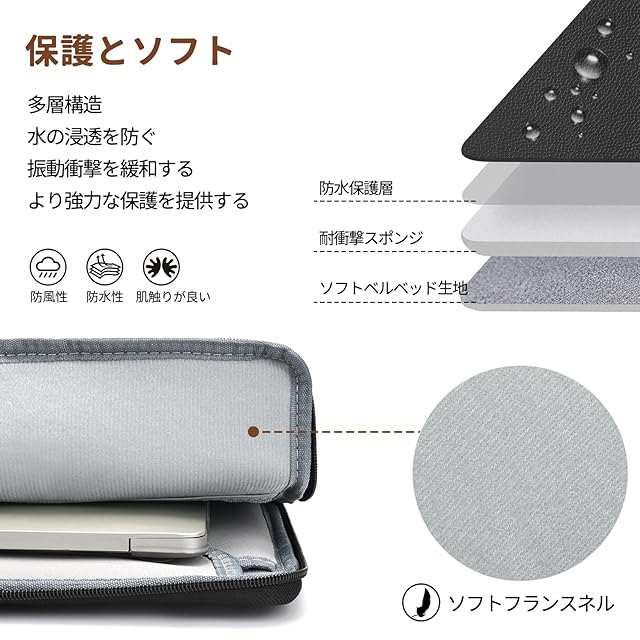 【360°全方位保護】:パソコンケース内部の厚くてふわふわしたクッションは衝撃吸収効果に優れています。 ジッパーの周りに保護パッドも付いており、傷を防止し、大切なノートパソコンを保護します。 耐水性のある生地は見た目以上に耐水性があります。 多少の汚れがついても拭くだけで簡単に取れます。 雨や雪からの水が浸入せず、大切なノートパソコンや周辺機器を濡れから守ります。