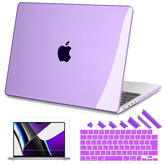 商品名:Teryeefi 2025 2024 2023 2021 MacBook Pro 14 インチ ケース M4/M3/M2/M1 Pro Max対応, スリム 軽量 排気口 透明 保護カバー&JIS日本語キーボードカバー&液晶保護フィルム&ダストプラグ,クリスタルパープル