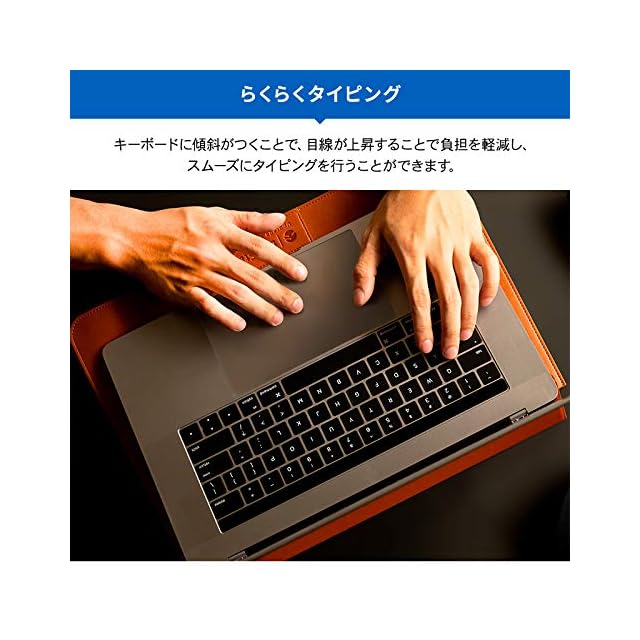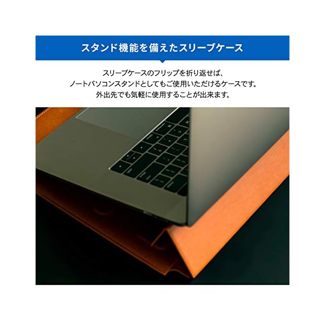 【スタンド機能を備えたスリーブケース】… スリーブケースのフリップを折り返せば、ノートパソコンスタンドとしてもご使用いただけるケースです。外出先でも気軽に使用することが出来ます。キーボードに傾斜がつくことで、目線が上昇することで負担を軽減し、スムーズにタイピングを行うことができます。