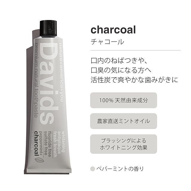 ココナッツ殻活性炭:ココナッツの殻を高温処理することでつくられる、何百万もの微細な穴のあいた活性炭。磁石のような吸着力をもち、口臭の原因となるニオイを取り除きます。さらに、ブラッシングにより歯の表面の汚れを取り除き、歯を白くする効果も。Davidsが使用するココナッツ殻活性炭は、粒子が非常に細かく、歯のエナメル質を傷つける心配はありません。
