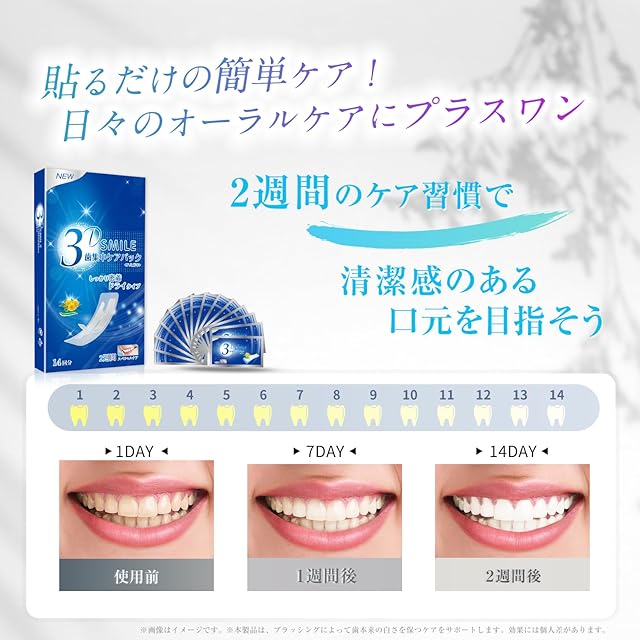 自宅で手軽に 3D Smile歯の集中ケアパックは、自宅で簡単にお使いいただける歯のケア用品です。忙しい日々の中でも、シートを貼るだけでスマートに歯のケアを実現します。