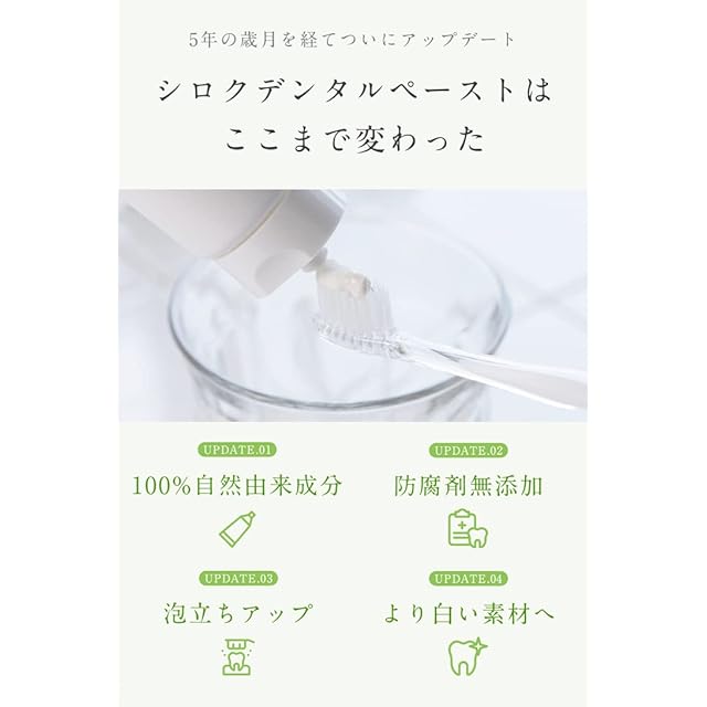 シロクデンタルペーストの2022年の大型アップデートバージョンです。「自然由来成分100%(全成分)×ホワイトニング」でよりナチュラルなホワイトニング歯磨き粉を目指しました。