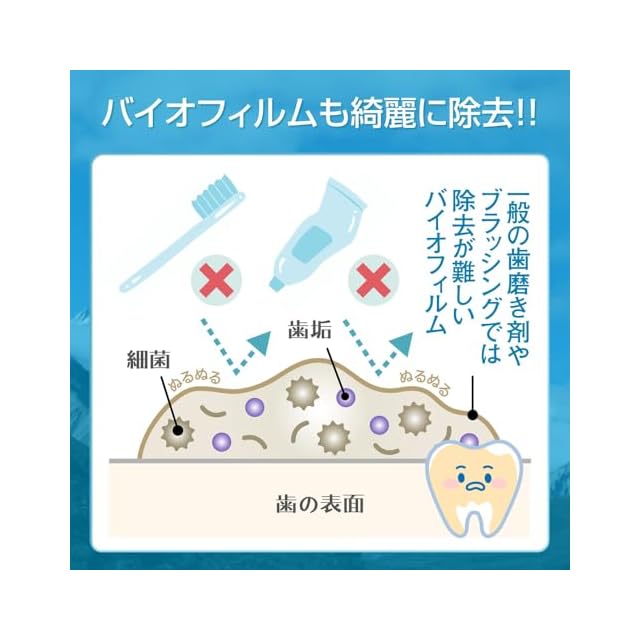pH10以上の強いアルカリで汚れを浮き上がらせ、歯に沈着した色素を洗浄し、歯を白くします。
