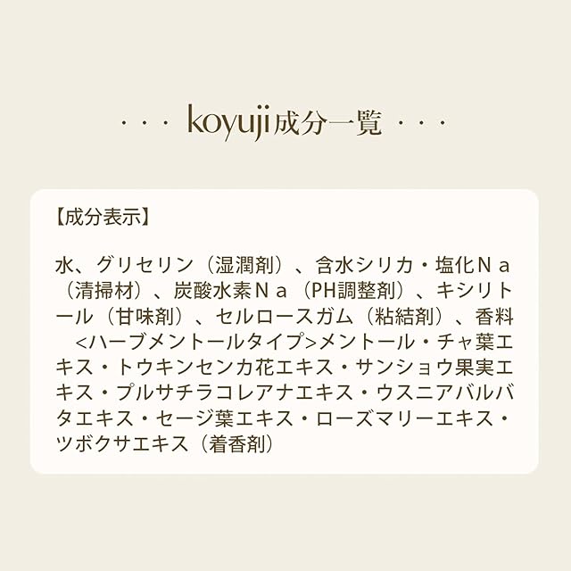 【KOYUJIの特長】 ●ミネラルをたっぷり含んだ松塩を使い、食品レベルの安全性 毎日のケアで安心してお使いいただけるように、化学成分は最小限にしました。食品レベルの安全性ですので、 万が一飲み込んでも安心です。 石油由来の成分や界面活性剤・研磨剤などは含まず、天然由来の成分で歯の汚れを落とし口腔内の健康を保ちます。 Koyujiの研磨剤の正体は、松塩の名前のとおり塩の粒。 硬い研磨剤の場合、強く磨きすぎると歯を傷つけてしまうこともありますが、塩の研磨剤は水溶性なので、 口腔内で溶けていきます。 刺激が少ないため、口に含むことに抵抗なくご使用いただける、健康と歯茎に優しい歯みがき剤です。 使用成分表より ●含水シリカ シリカは多孔質で、汚れや匂いを化学的に吸着する作用が有る。 また、微粉末シリカは、エナメル質を傷つけずコーティングし、優しく汚れを落とす効果があります。 ●炭酸水素Na 「重曹」として食品にも使用。重曹は歯磨きに使用すると歯の汚れを落とす効果が有ります。