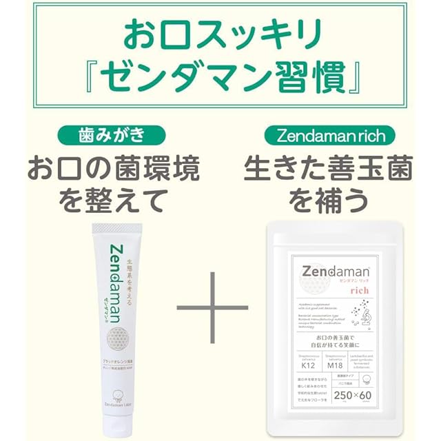 ✅⽇本製。殺菌ではなく⼝内フローラを整え、⼝内に良い菌を増やすことに着⽬し、 安⼼して毎⽇の⽣活に取り⼊れられます。「Zendaman」タブレットとセットでお 使いいただくことを推奨しております。