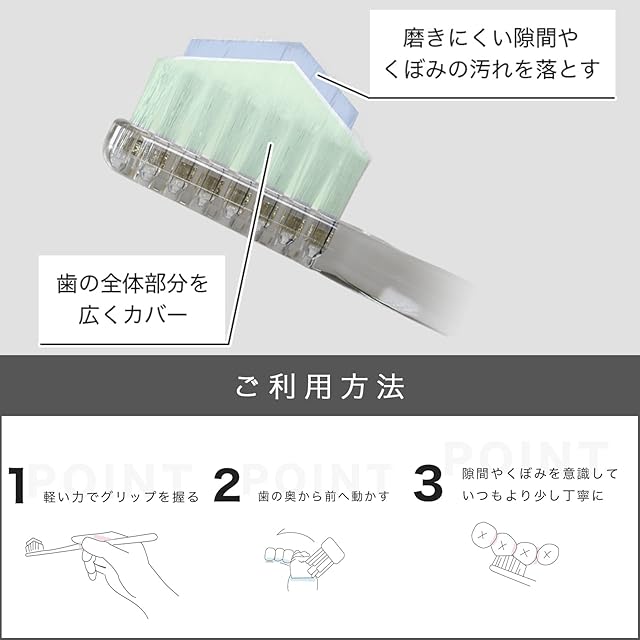 ご注意 本品は毛先の性質上、虫歯や歯科矯正器具等のすき間に挟まり、毛が抜けることがあります。その際は直ちに使用を中止し、新しい歯ブラシにお取替え下さい。 変色、変形の恐れがありますので、塩素系殺菌剤、漂白剤、熱湯に漬けないで下さい。 軽い力で小刻みに磨きましょう。 使用後はよく水洗いし、乾燥させて保管して下さい。