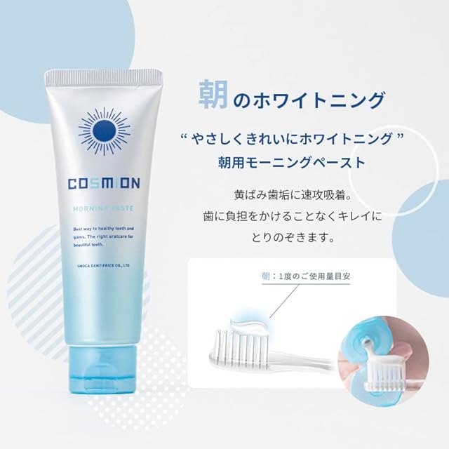 【朝のホワイトニング 100g x3本セット】“やさしくきれいにホワイトニング”朝用ホワイトニングハミガキコ。歯を削る恐れのある研磨剤ではなく歯に優しい「高吸着シリカ」を採用しました。黄ばみや歯垢に速攻で吸着して除去することで歯に負担をかけず、汚れをキレイに剥がします。弱アルカリ性仕様で口内トラブルから歯を守り、汚れを逃さず吸着する事で、外的要因からくる口臭も防止します。フッ素は950ppm配合なのでお子様と一緒に使える低発砲のハミガキコです。