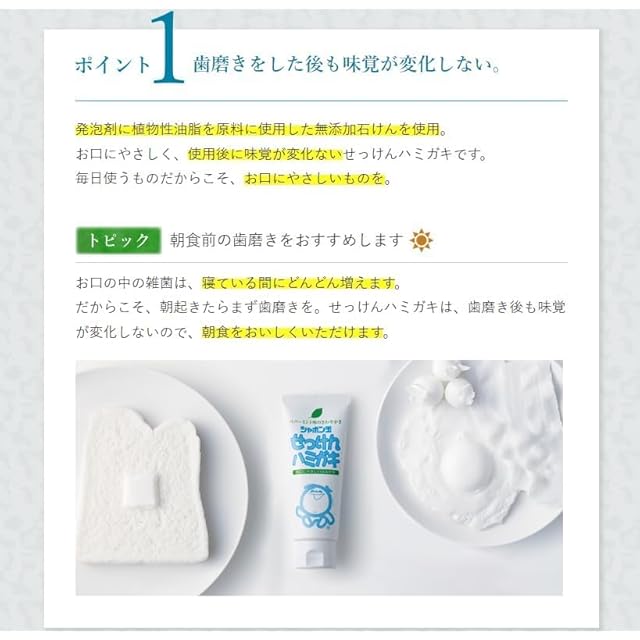 歯磨きをした後も味覚を損いません 無添加石けんをベースとしており、お口に優しく、使用後は味覚を損うことはありません。