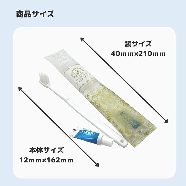 形状:24穴先細タイプ 毛材質:PBT毛 入数:100本 歯磨き粉:3g 本体サイズ:12×162mm 袋サイズ:40×210mm 袋タイプ:マット 製造国:中国 先細加工を施した歯ブラシを採用。 歯磨き粉付き歯ブラシセット