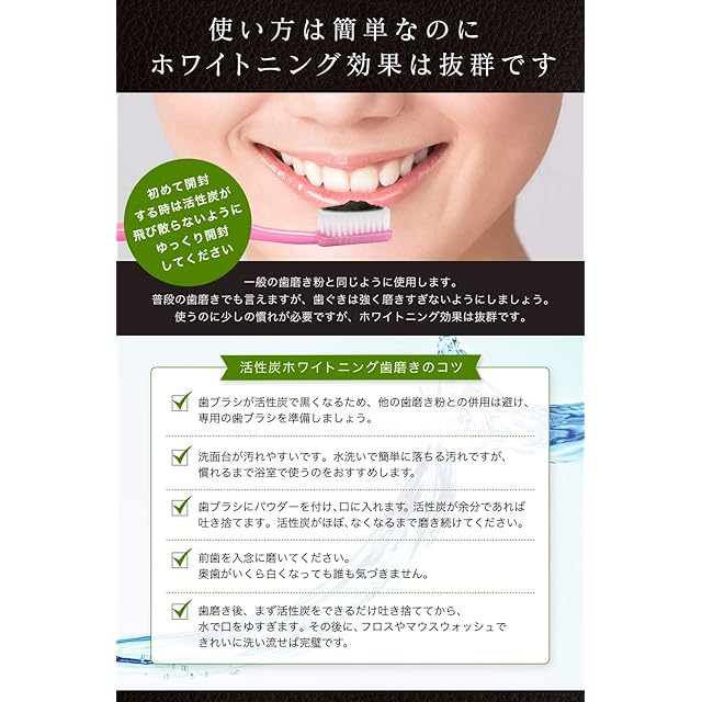 ✅【簡単な使用方法】使用法は簡単、一般の歯磨き粉を使うように使用してください。ただ、歯ブラシが活性炭で黒くなるため、他の歯磨き粉との併用は避け、Pure White専用の歯ブラシを準備する事をお勧めします。初めて開封する時には活性炭が飛び散る事があるのでゆっくりと開封して下さい。