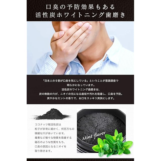 ・炭がニオイの元を吸着し、口臭の予防効果もあるホワイトニング炭歯磨きです。炭の無数の穴が、歯垢も吸着・除去します ・歯科医で行うホワイトニングに比べ1/10以下の値段です。短期集中でやるのも良いですし、白さ維持の為に週に1-2度使うのも効果的です・コーヒーやタバコ、ワイン等で黄ばんだ歯を効果的に白くする活性炭! 白い歯は笑顔を引き立て、仕事でもプライベートでも第一印象を良くします ・口臭を防ぎ、歯のヤニを取る効果もある上、従来の製品と違い、苦痛を伴わずに歯を白くする事ができます ・使用法は簡単、一般の歯磨き粉を使うように使用してください。ただ、歯ブラシが活性炭で黒くなるため、他の歯磨き粉との併用は避け、Pure White専用の歯ブラシを準備する事をお勧めします。初めて開封する時には活性炭が飛び散る事があるのでゆっくりと開封して下さい。