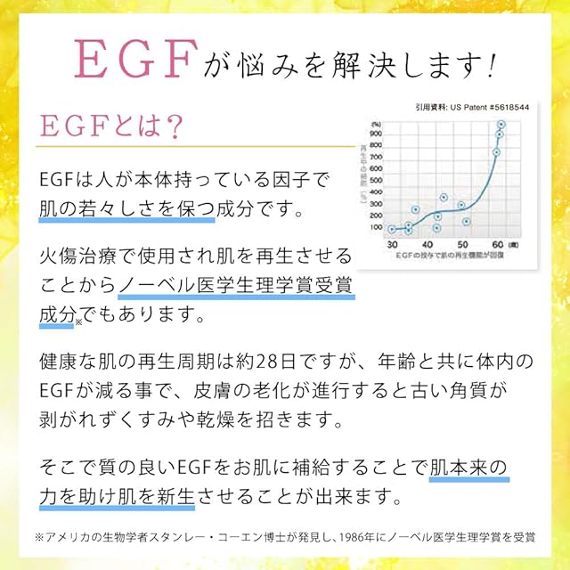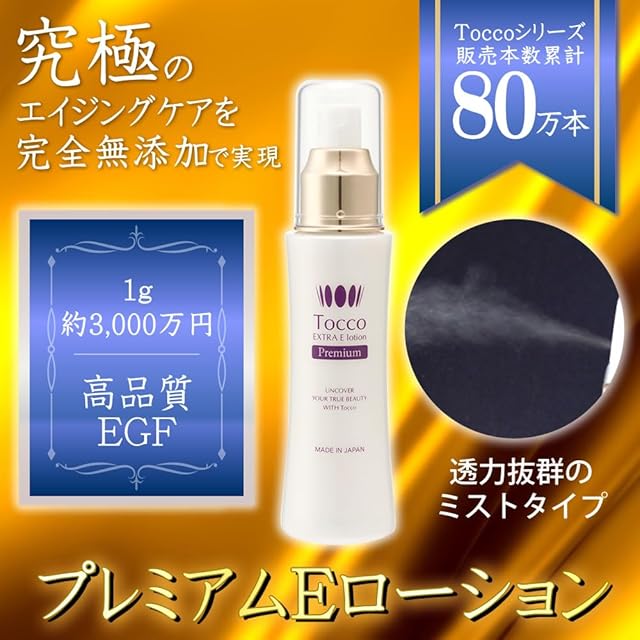 【高純度EGFで攻めるエイジングケア】化粧品原料は、ピンキリで品質に差があります。EGFは非常に高価なため多くの原料が水や糖質で薄められていました。薄まったEGFでは肌実感を感じにくいと考え、Toccoでは研究レベルのもの(1gおよそ3000万円)をアメリカから特別に取り寄せています。