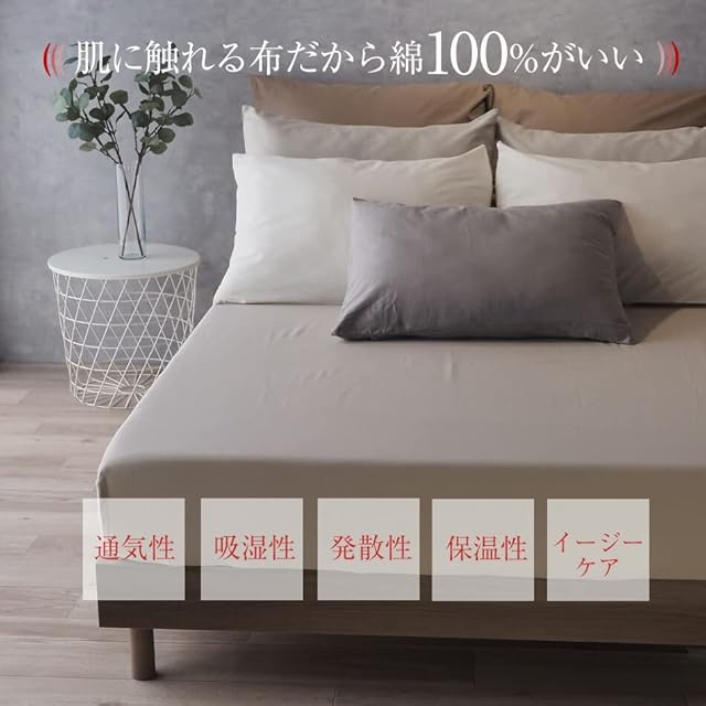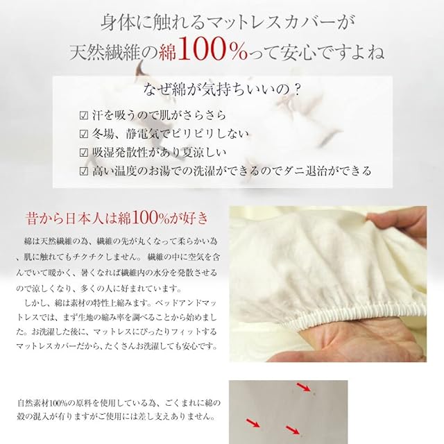 【マットレスカバー】★身体に触れるマットレスカバーが天然繊維の綿100%って安心ですよね。綿は天然繊維の為、繊維の先が丸くなって柔らかい為、肌に触れてもチクチクしません。 繊維の中に空気を含んでいて暖かく、暑くなれば繊維内の水分を発散させるので涼しくなり、多くの人に好まれています。打ち込み本数(糸密度)約200本の丈夫で美しい生地。なめらかな中に張りのある触り心地です。自然な風合いがあり、織り目が密で丈夫です。自然な風合いをなめらかさの中に張りのある触り心地を味わってください。綿は素材の特性上、縮みます。ベッドアンドマットレスでは、まず生地の縮み率を調べることから始めました。お洗濯した後にマットレスにぴったりフィットするマットレスカバーだから、たくさんお洗濯しても安心です。