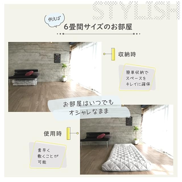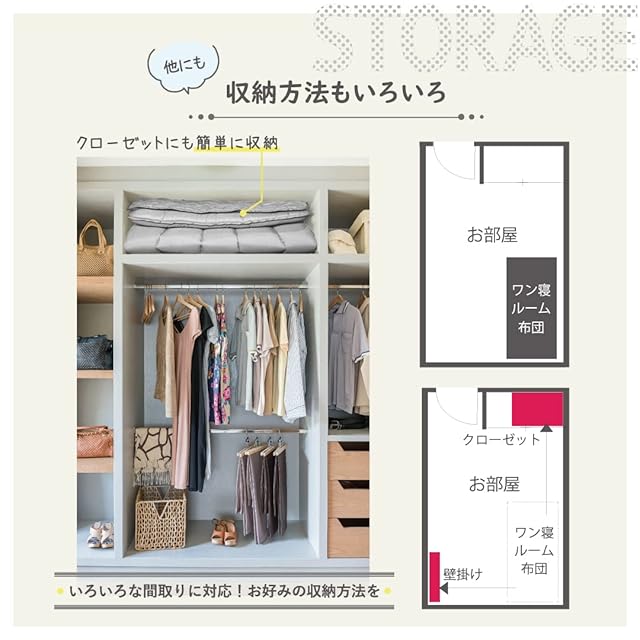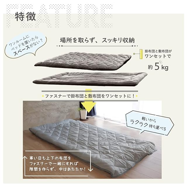 【片付けられないワンルームは、もう終わり】狭い部屋でも楽々片付け! 掛布団と敷布団がワンセットで5kgだから持ち運び易く楽々収納。収納方法もいろいろ