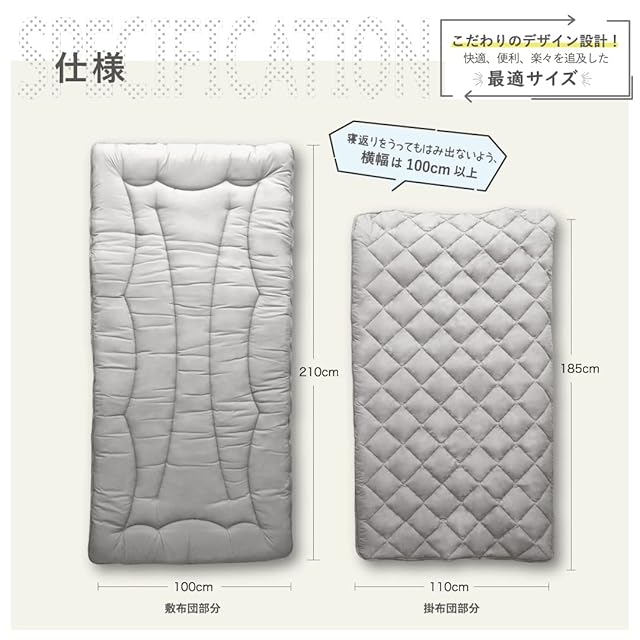 【布団屋のこだわり】寝返りしてもはみ出さないサイズ、フローリング使用時でも痛くならない厚さ。しっかりシングルサイズをキープ。快適、便利、楽々を追求したサイズ調整