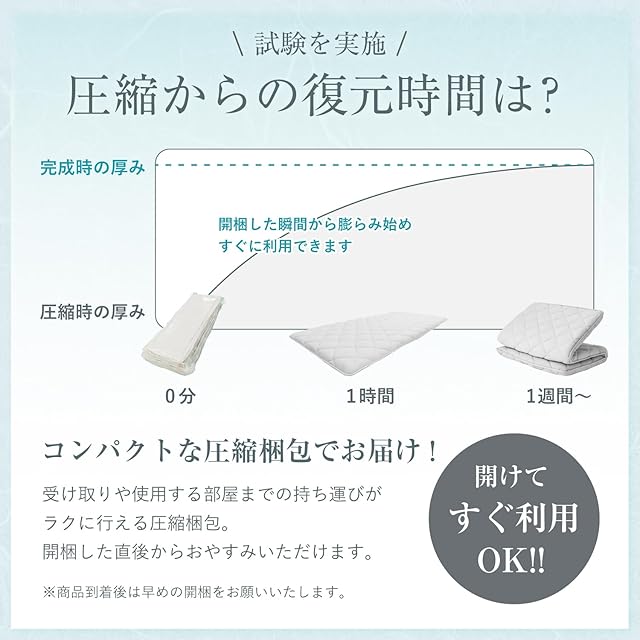 コンパクトな圧縮梱包でお届け!受け取りや使用する部屋までの持ち運びがラクに行えます。 開梱した直後からおやすみいただけます。 復元まで数日かかる場合がございます、天日干しや布団乾燥機で温かい空気を送り込んでいただくと膨らみが早まります。 商品到着後は早めの開梱をお願いいたします。