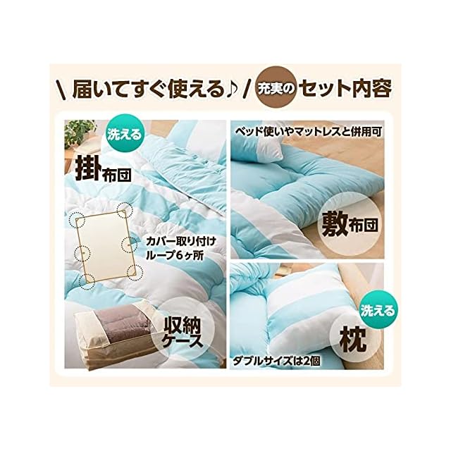 届いた日から使える布団セット ほこりの出にくい 寝具 4点セット (D) ダブル 【 掛布団 (1) 敷布団(1) 枕 (2) 収納袋 (1) 】