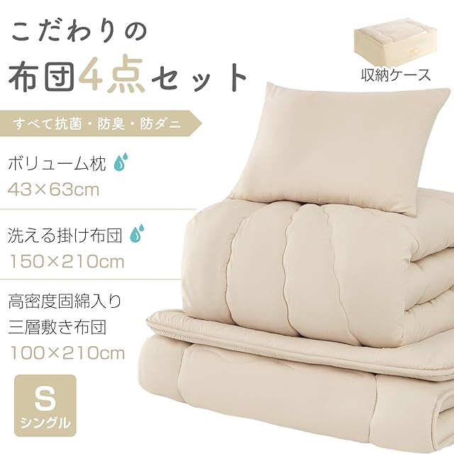 布団セット シングル 4点セット 寝具セット 洗える 来客用布団セット SEK認証抗菌防臭・防ダニ 【高密度固綿入り 三層敷布団・中綿1.6kg掛け布団・枕・収納ケース】ピーチスキン加工 ホコリ出にくい オールシーズン 新生活 コンパクト 低ホルムアルデヒド 柔らかい ベージュ