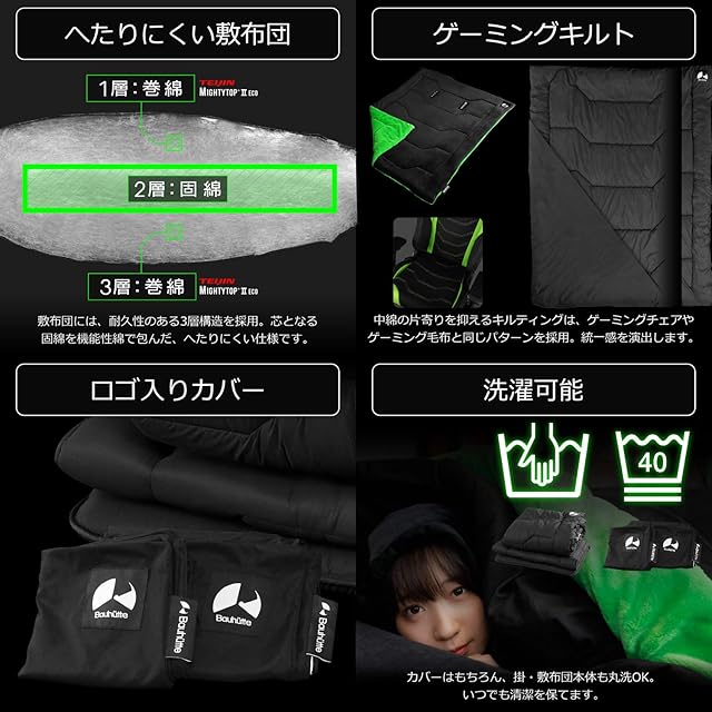 【幅160cm大判掛布団】ゆったりワイド仕様でスマホタイムや就寝中の大きな寝返りにも対応。【便利な4点セット】届いたらすぐに使える、掛・敷布団に各カバーが付いた4点セット。【ゲーミングキルト】中綿の片寄りを抑えるバウヒュッテ独自のキルティングを採用。ゲーミングチェア、ゲーミング毛布「わたタンク」と同じデザインで、統一感のあるデザイン。【洗濯可能】カバーはもちろん、掛・敷布団本体も丸洗OK。