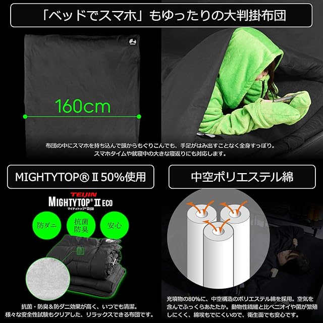 【MIGHTYTOPⅡ50%使用】テイジンの防ダニ機能中綿を50%採用しています。抗菌・防臭&防ダニ効果が高く、いつでも清潔。【中空ポリエステル綿】充填物の80%に、中空構造のポリエステル綿を採用しています。空気を含んでふっくら&あたたかく、身体を包み込むような寝心地を実現。【へたりにくい敷布団】敷布団には、耐久性のある3層構造を採用。芯となる固綿を機能性綿で包んでいます。