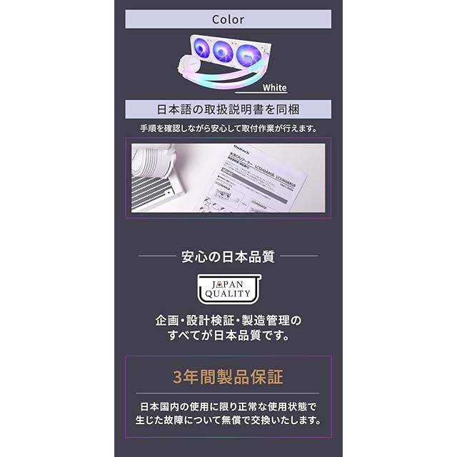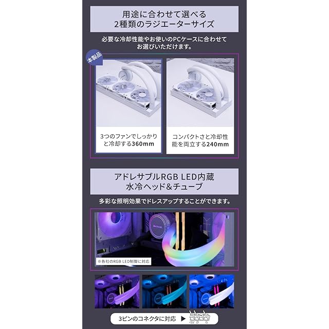 オールホワイト系のゲーミングPCに最適な水冷CPUクーラー:本体の細かな部分まで白にこだわった、華やかな光を引き立たせるのに最適なCPUクーラーです。PC内部を彩りながらPCゲームや動画編集で発熱したCPUを効率的に放熱します。使用環境や用途に合わせて選べる2種類のラジエーターサイズ:コンパクトさと冷却性能を両立する240mmサイズの「OWL-LCS240ARGB-WH」と、3つのファンで確実にしっかりと冷却する360mmサイズの本製品の2モデルを展開。必要な冷却性能やお使いのPCケースに合わせてお選びいただけます。