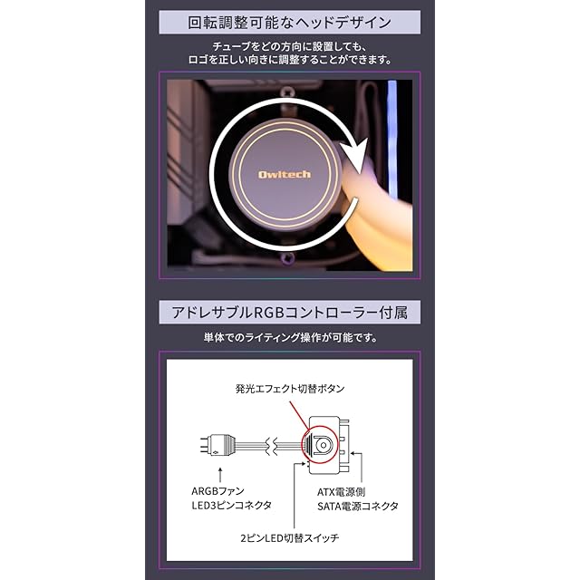 回転調整可能なヘッドデザイン:チューブをどの方向に設置しても、ロゴを正しい向きに調整することができます。アドレサブルRGBコントローラー付属:3ピンのアドレサブルRGBコントローラーが付属しており、単体でのライティング操作が可能です。