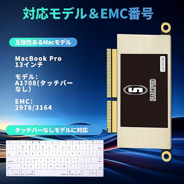 【対応機種モデル】Mac SSDは、Macシステムのアップグレードに特化して設計されており、以下のモデルと互換性があります: MacBook Pro 13インチ A1708(Late 2016-Mid 2017), EMC番号: 2978/3164. ご注意: 非タッチバーモデルに対応。詳細な対応モデルのリストについては、画像をご参照ください。モデルとEMCは同時に一致する必要があります、そうしないとSSDは動作しません。