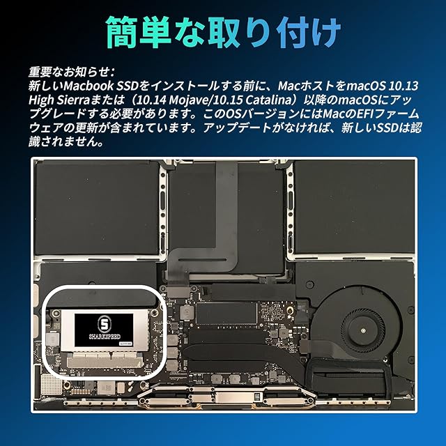 【注意事項】新しいMacbook SSDをインストールする前に、MacホストをmacOS 10.13 High Sierraまたは(10.14 Mojave/10.15 Catalina)以降のmacOSにアップグレードする必要があります。これらのOSバージョンにはMacのEFIファームウェアの更新が含まれています。アップデートがなければ、新しいSSDは認識されません。macOSはプリインストールされているので、わずか数ステップで、Macの登録とセットアップが完了します。