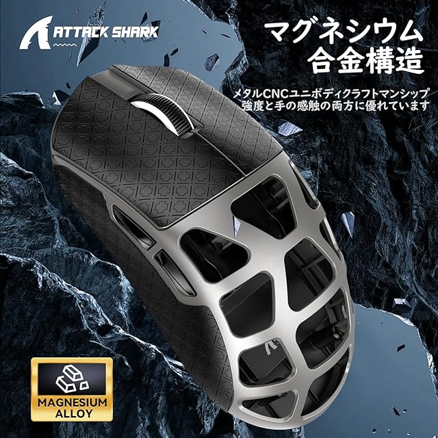 ATTACK SHARK R3 ゲーミングマウス マグネシウム合金 ワイヤレス PAW3395 8000hz 46g 超軽量 2.4G/Bluetooth/USB有線 26000DPI 急速充電 アンチスリップテープ付き コイルケーブル付き 技適取得済み(シルバー)