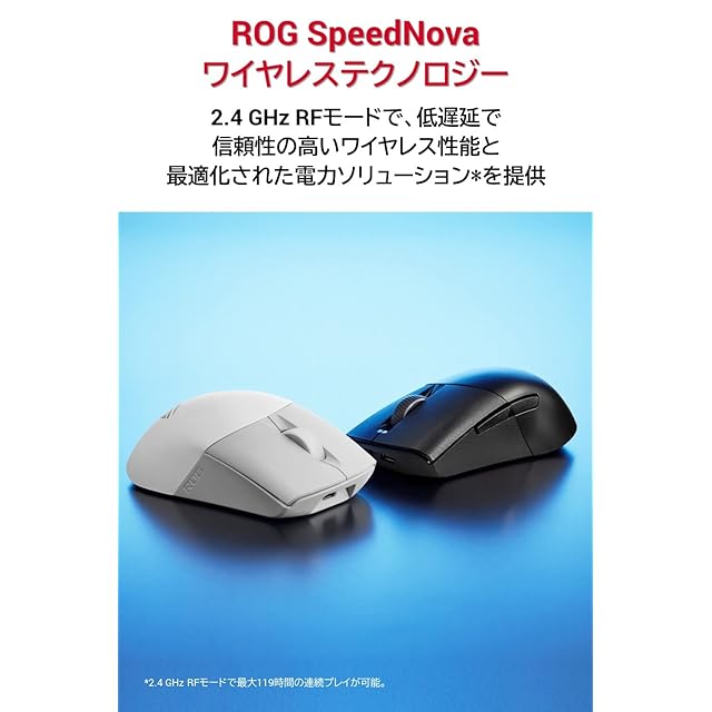 ROG SpeedNovaワイヤレステクノロジー:2.4 GHz RFモードで、低遅延で信頼性の高いワイヤレス性能と最適化された電力ソリューションを提供