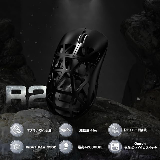 【超軽量45g】スケルトンフレームとマウスの素材にマグネシウム合金を使用することで、R2マウスは超軽量かつ驚異的な耐久性を実現しています。R2マウスの重量はなんと43g(±2)。マウスを軽く保ち、電池寿命も長い。R2は実使用で最大68時間使用可能です。