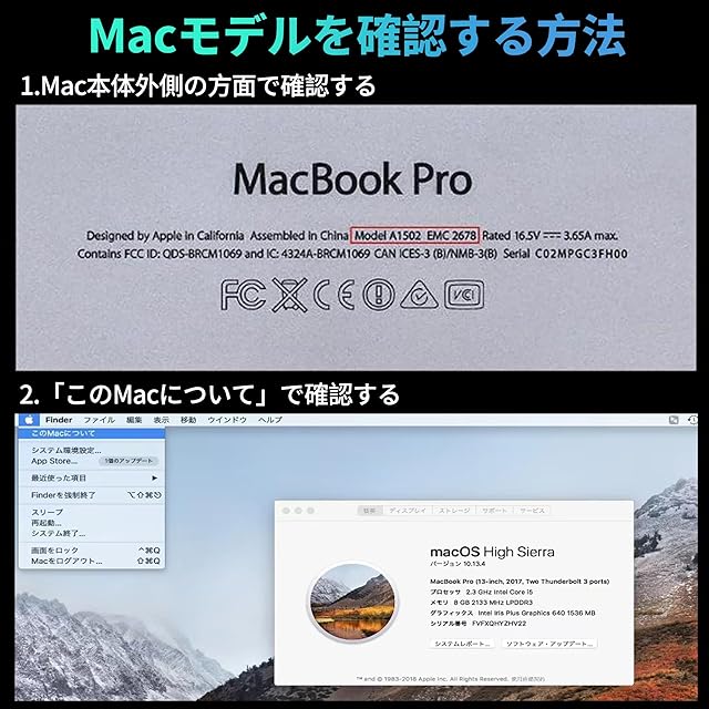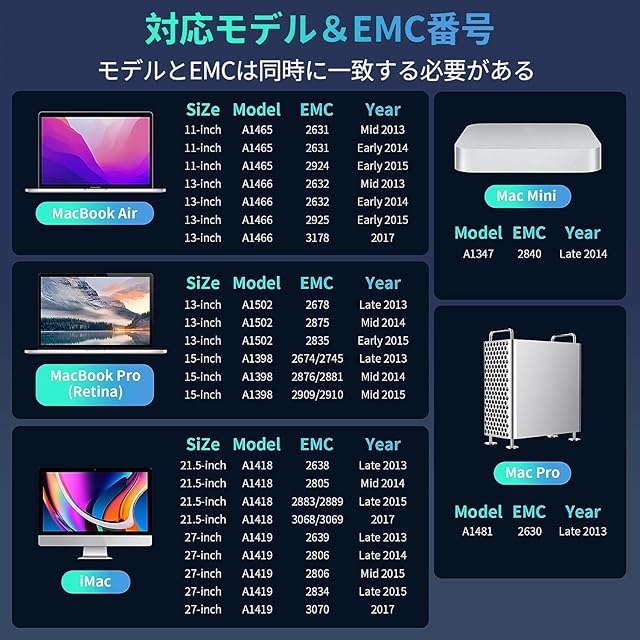 【対応機種モデル】Mac専用 SSDは、macOSのアップグレードに特化して設計されており、以下のモデルと互換性があります: MacBook Air A1465 A1466 (Mid 2013-2015,2017), MacBook Pro A1502 A1398 (Retina 2013-2015), iMac A1418 A1419 (2013-2017), and Mac Mini A1347 (Late 2014), Mac Pro A1481 (2013). ご注意:詳細な対応モデルのリストについては、画像をご参照ください。モデルとEMCは同時に一致する必要があります、そうしないと新しいSSDは認識されません。