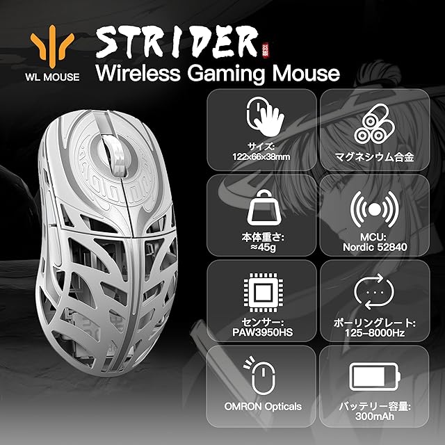 WLMOUSE Strider ワイヤレス ゲーミングマウス 左右対称 8KHzポーリングレート対応 マグネシウム合金製 45g軽量 PAW3950HSセンサー 【日本正規代理品】 (OM, White)